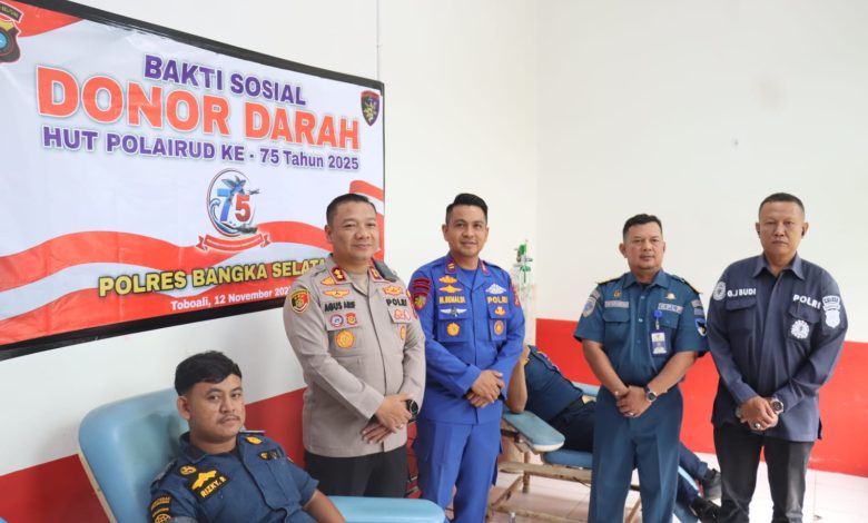 TOBOALI, BABELINES.COM – Satuan Kepolisian Perairan dan Udara (Polairud) Polres Bangka Selatan (Basel) menggelar kegiatan donor darah dalam rangka memperingati Hari Ulang Tahun (HUT) ke-75 Korps Polairud tahun 2025, di Rumah Sakit Umum Daerah (RSUD) Junjung Besaoh Bangka Selatan, Selasa (12/11/2025).