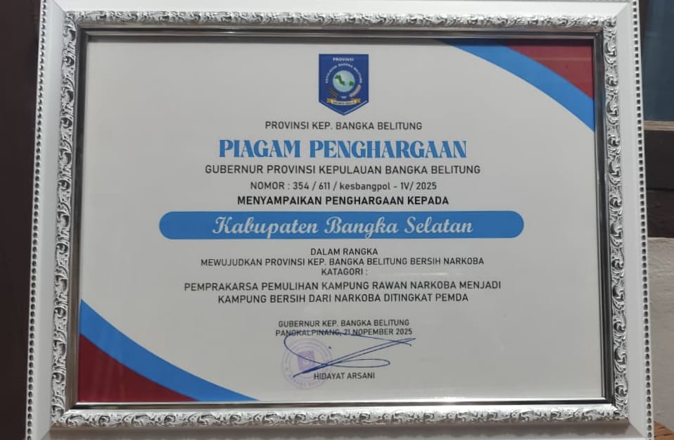 HUT ke-25 Bangka Belitung, Bangka Selatan Terima Penghargaan Kampung Bersih Narkoba dari Gubernur Hidayat Arsani