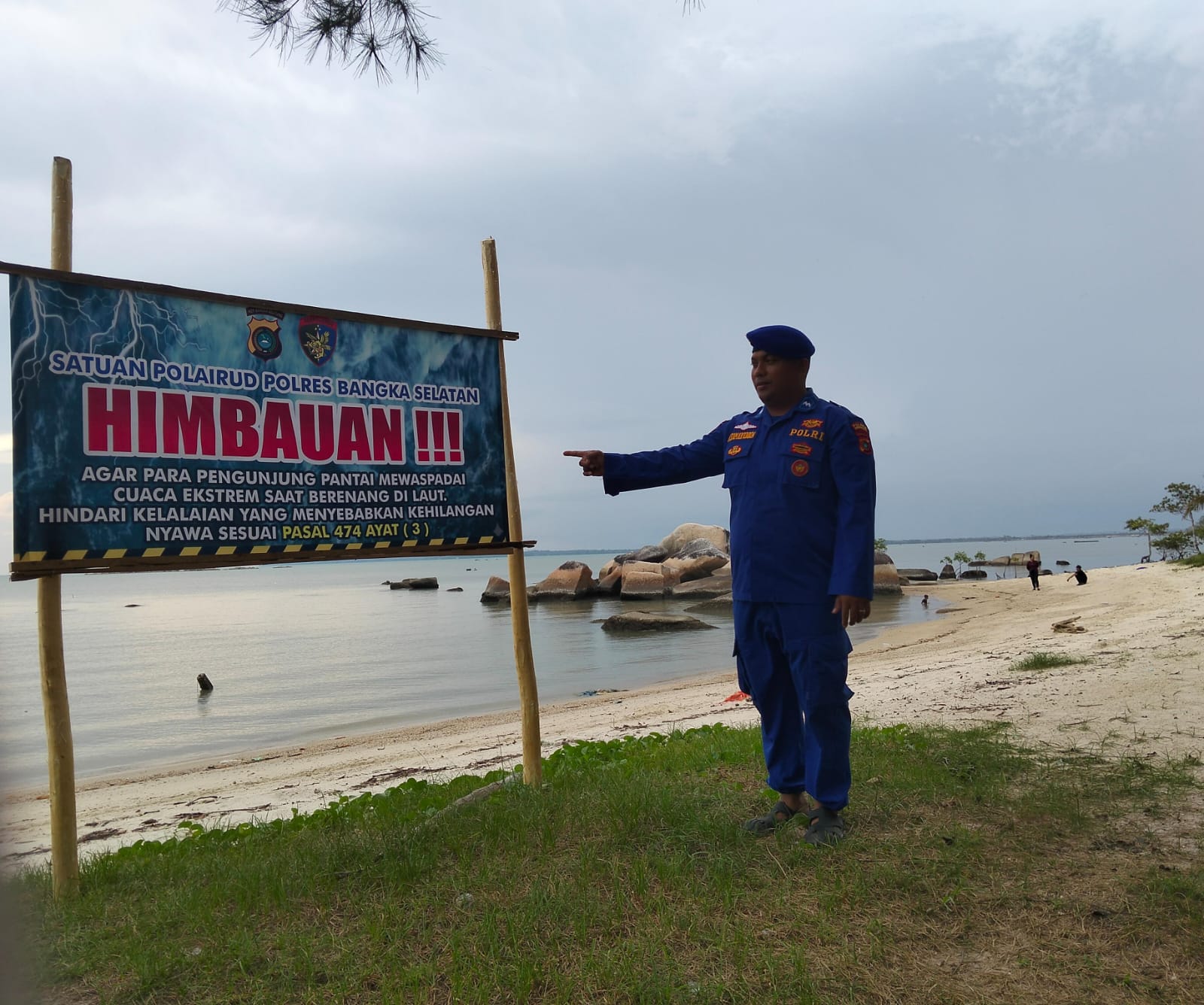 Satpolairud Polres Basel Pasang Spanduk Imbauan di Pantai Tanjung Kerasak, Antisipasi Risiko Libur Lebaran