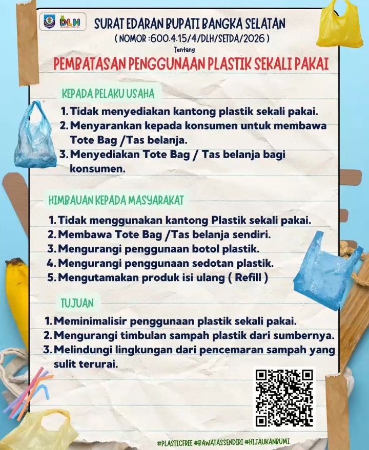 Surat edaran tersebut dikeluarkan oleh Bupati Bangka Selatan dengan nomor 600.4.15/4/DLH/SETDA/2026 yang mengatur langkah konkret bagi pelaku usaha maupun masyarakat dalam mengurangi penggunaan plastik sekali pakai.