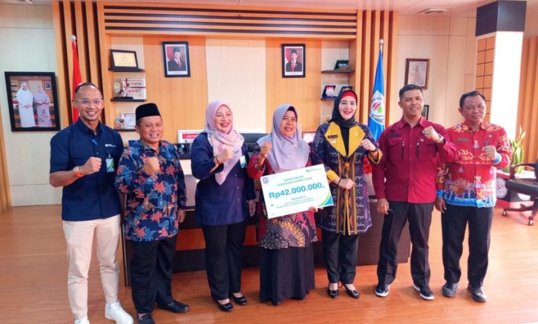 BANGKASELATAN, BABELINES.COM – Wakil Bupati Bangka Selatan Debby Vita Dewi menyerahkan santunan jaminan kematian senilai Rp42 juta dari Badan Penyelenggara Jaminan Sosial (BPJS) Ketenagakerjaan Pangkalpinang.